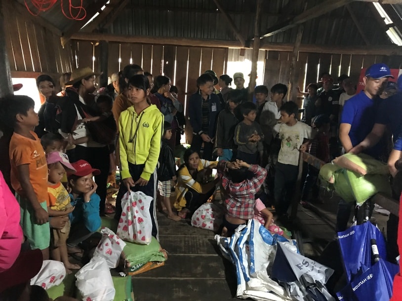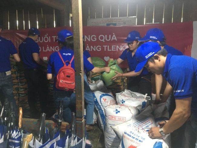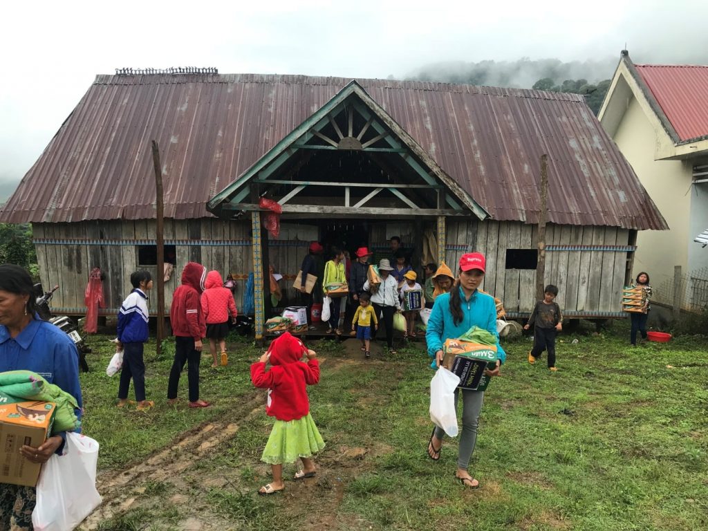Kế hoạch ban đầu đoàn chúng tôi sẽ phát quà cho bà con tại UBND xã nhưng do thời tiết không ủng hộ đoàn, hiện đang có áp thấp nhiệt đới, bà con phải đi bộ một đoạn đường xa, mới tới tập được UBND xã vì vậy đoàn chúng tôi cùng hội chữ thập đỏ quyết định di chuyển nơi trao quà cho bà con tại nhà rông giữa hai làng