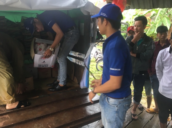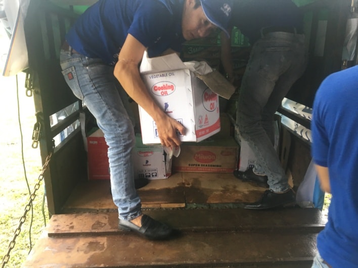 Mỗi người một công việc, các phần quà như: mì tôm, gạo, bột ngọt, nước mắm, dầu ăn… được chúng tôi sắp xếp gọn gàng sẵn sàng trao cho tới tay cho bà con